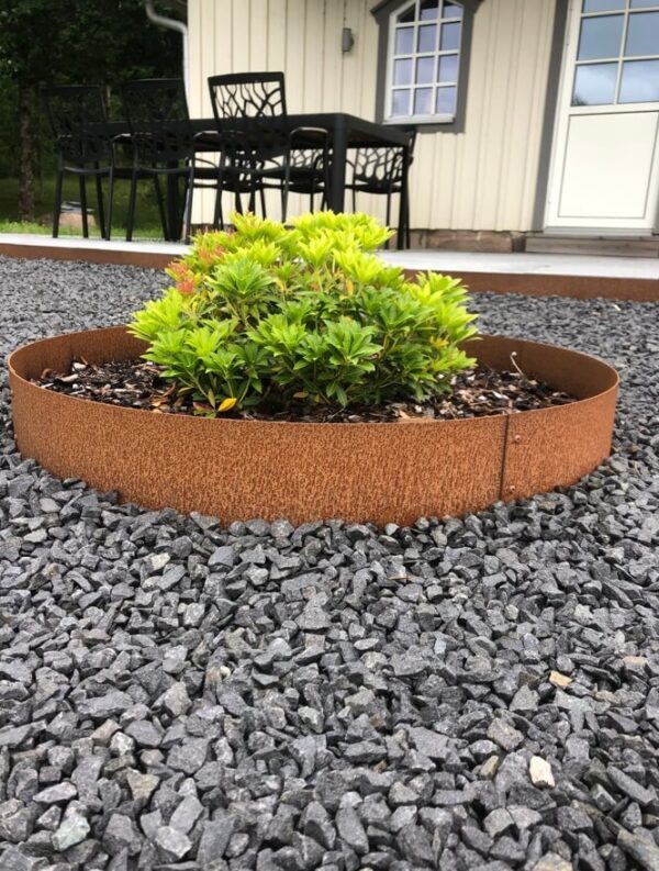 Kantstålscirkel i corten rostar vackert över tid och ger ett rustikt intryck till trädgården. Höjden är 12cm och trycks ner lite i marken för att få stöd från sidorna, alt. Färsts med jordankare i samma familj. Går att matcha med svängda bitar i samma serie och cirklar för att få en helhet i trädgården. OBS. under rostprocessen kan viss utfällning ske så skydda närliggande sten eller liknande från rosten i de lägena, vill mamn påskynda processen kan man spraya saltvatten på stålet, då går rostprocessen på ett par dagar.